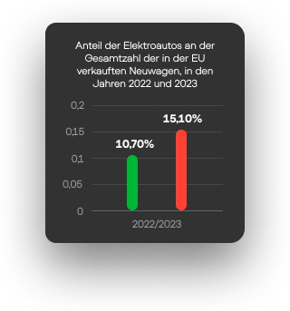 Nach Angaben des Verbands der Europäischen Automobilhersteller (ACEA) werden im Jahr 2023 neue Elektrofahrzeuge zumersten Mal die Popularität von Dieselfahrzeugen übertreffen. Der Anteil der Elektroauto-Zulassungen stieg um 21%. Infolgedessen wuchs der EU-Markt für batteriebetriebene Fahrzeuge um fast eine Million Einheiten2 Darüber hinaus ist der Anteil der reinen Elektroautos an den gesamten Neuwagenverkäufen auf dem EU-Marktim Jahr 2023auf 15,1% gestiegen, gegenüber 10,7% im Vorjahr
